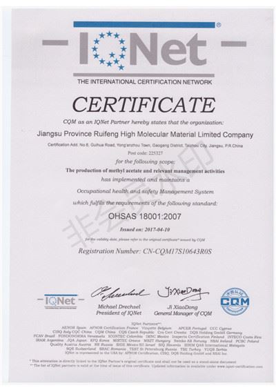 Anhui Ruibai New Materials Co., Ltd. (Taizhou Ruibai Chemical Co., Ltd.) was founded in 2009. We locate at Huaibei Anhui / Taizhou Jiangsu, with very convenience transportation network around. With the goal our product and service to be the first choice of our customers, RUIBAI focuses on the production and distribution of Methyl Acetate, Ethyl Acetate, Glacial Acetic Acid and Methylene Chloride, annual sales volume over 300000 MT. RUIBAI continues expanding and developing, we already obtained REACH, ISO19001, ISO14001, OHSAS18001 certificates.