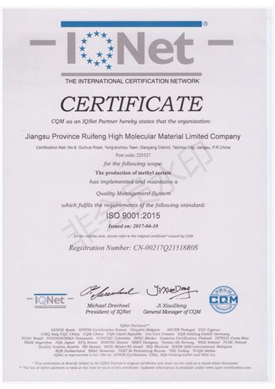 Anhui Ruibai New Materials Co., Ltd. (Taizhou Ruibai Chemical Co., Ltd.) was founded in 2009. We locate at Huaibei Anhui / Taizhou Jiangsu, with very convenience transportation network around. With the goal our product and service to be the first choice of our customers, RUIBAI focuses on the production and distribution of Methyl Acetate, Ethyl Acetate, Glacial Acetic Acid and Methylene Chloride, annual sales volume over 300000 MT. RUIBAI continues expanding and developing, we already obtained REACH, ISO19001, ISO14001, OHSAS18001certificates.